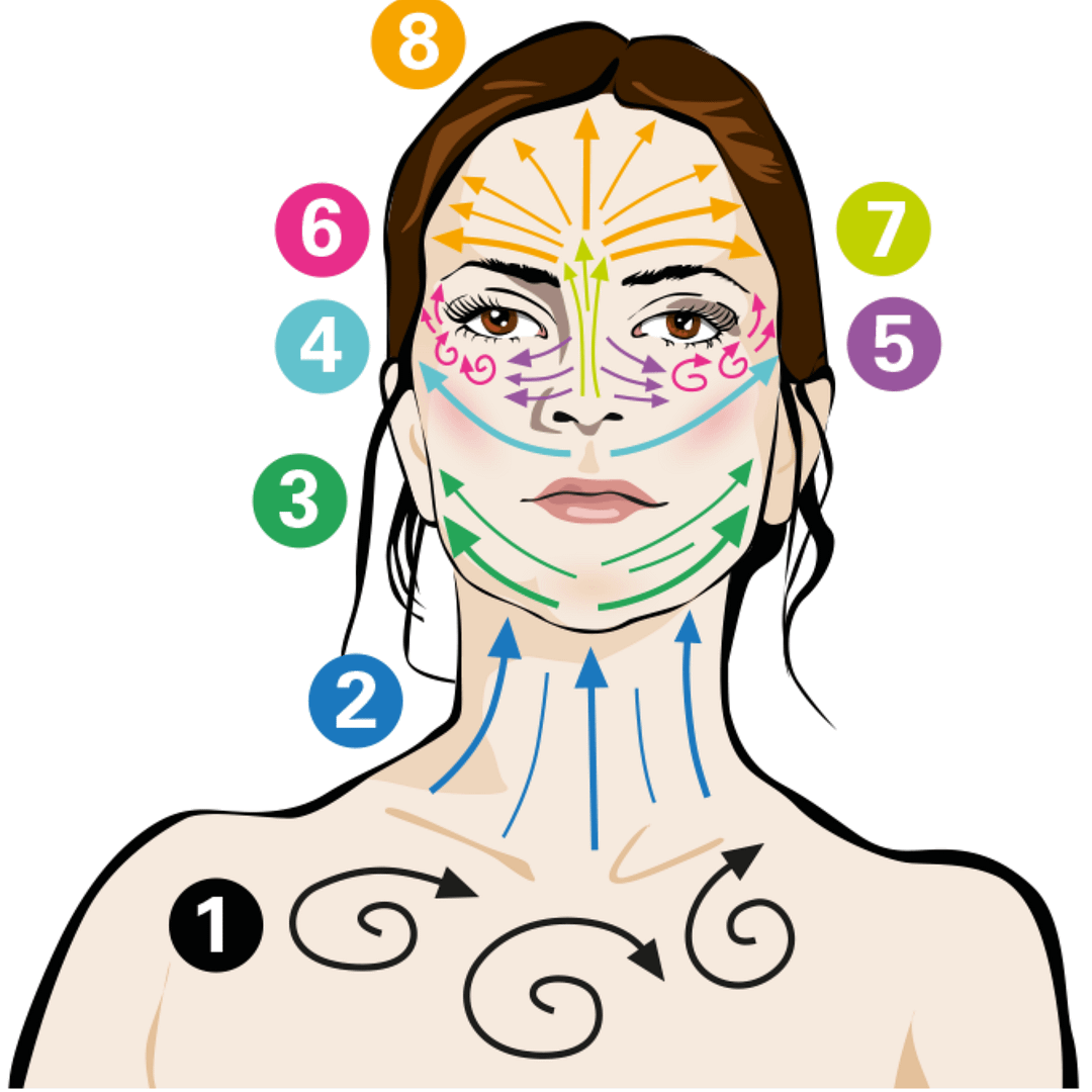 A simple, clear diagram showing the direction of strokes for lymphatic drainage on the face and neck. Arrows could indicate gentle, upward, and outward movements along the jawline, towards the ears, down the sides of the neck, and towards the collarbone. Highlight areas around the eyes, temples, cheeks, and under the chin, directing fluid towards the neck lymph nodes.